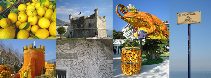 中世の要塞跡を利用した建物の中には、絵画、タピストリー、陶芸作品など幅広い作品が展示されている。市庁舎にはコクトーの壁画が描かれた「結婚の間」がある。旧市街へ坂道を登ると、バロック建築の街並みが続く。ベルエポックと呼ばれる時代に、世界各国の貴族が避寒に訪れ、カジノやパラスが建てられたが、旧市街には人々の暮らしがみられ、漁村の雰囲気が残る。見下ろす眺めは碧く続く海岸線。毎年2月に開催されるレモン祭は、ニースのカーニバルとともにコート ダジュールに春を呼ぶ祭りとして名高い。レモンやオレンジなどで飾られた山車のパレードが行われ、Jardin Biovès /ビオヴェ庭園には柑橘類で作られた沢山のオブジェが並び、街全体がさわやかな香りでいっぱいになる。モナコ方面に足をのばせば、Cap Martinの海辺には、